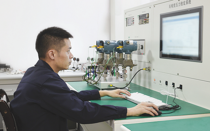 图为计量检定员正在批量检定压力变送器。张昀 摄