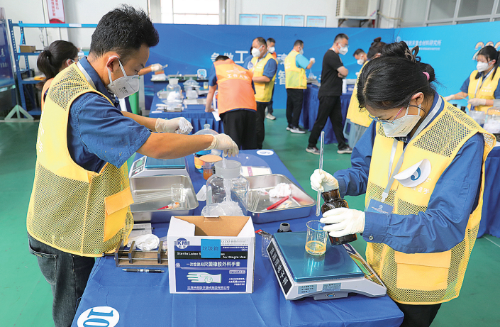 图为选手进行配胶操作比拼。张蓉敏 摄
