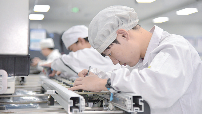 图为电装操作人员正在进行电子元器件插装。范钦华 摄